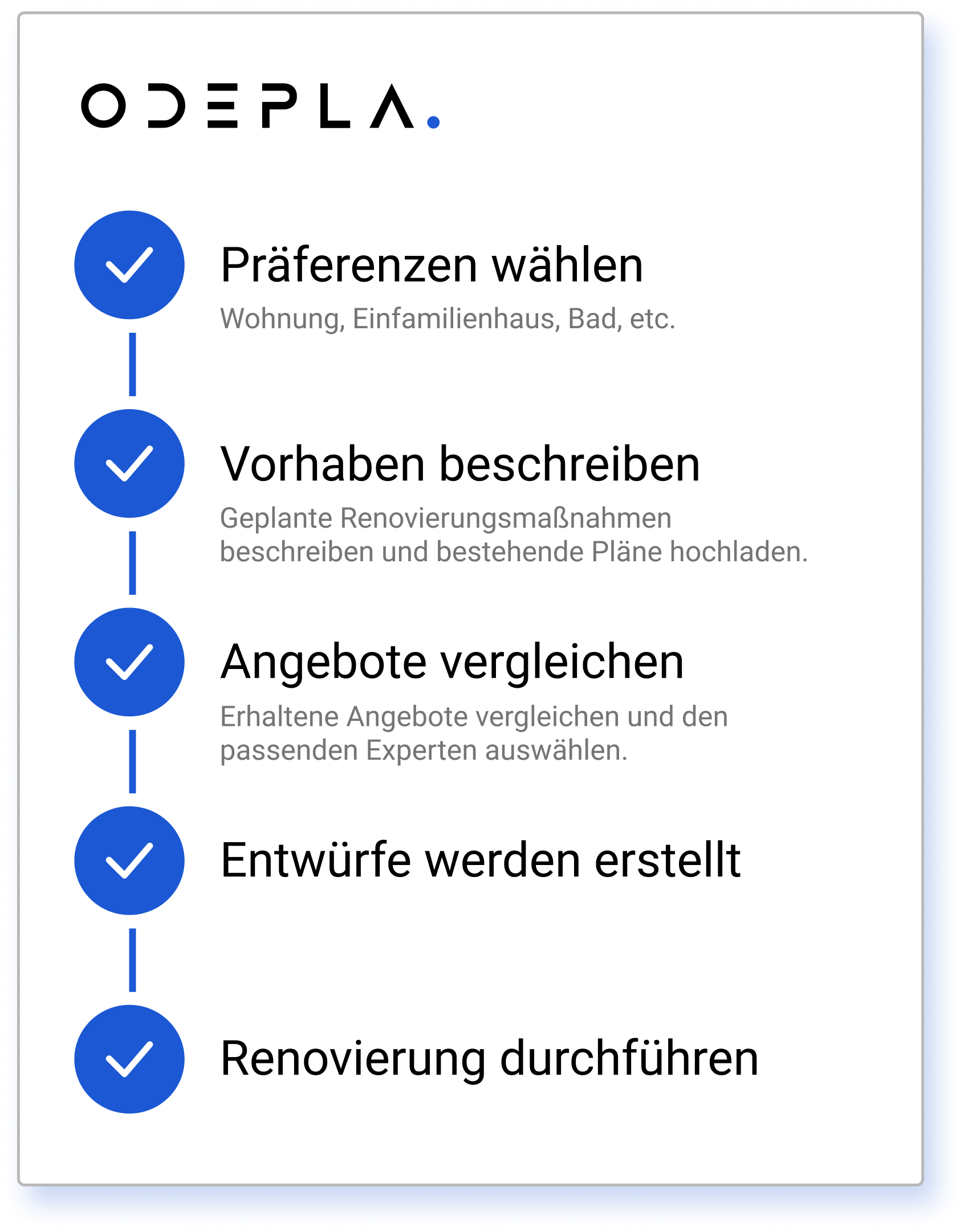 Odepla verbindet Sie mit qualifizierten Architekten aus unserem wachsenden Expertennetzwerk für eine individuelle Bearbeitung Ihres Renovierungsprojektes.